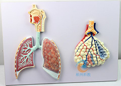 本模型顯示了呼吸道、鼻腔、口腔至氣管,支氣管以及進(jìn)入肺葉的右支氣管樹,另一邊設(shè)計了,放大的肺泡模型,用來顯示組織學(xué)上關(guān)于肺泡的微觀顯微結(jié)構(gòu)。