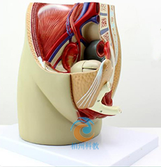 這個真人大小的模型,可拆分三部分組成,展示了女性盆腔系統(tǒng)的所有重要結構,并且非常詳細地展示了腹腔和骨盆肌,女性泌尿生殖系統(tǒng)的內(nèi)部結構非常詳細描繪。全部手工上色,并且配有數(shù)字指示標識