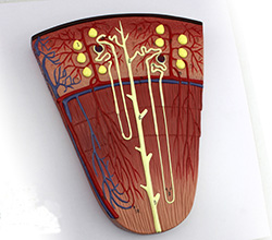 該模型顯示腎單位結構、腎小體(也稱為腎小球)和腎小管等結構,共有19個部位指示標志。